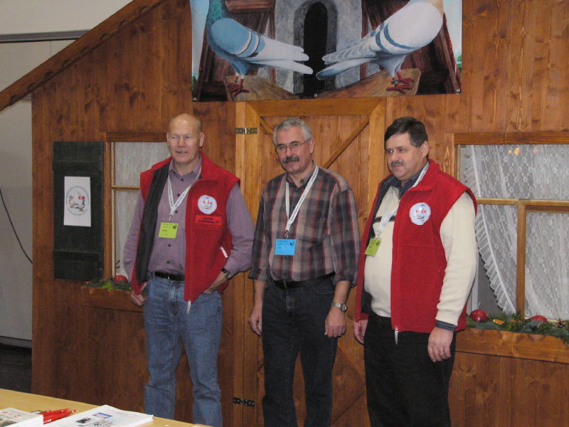 Die Zfrd. Erwin Bär, Wolfgang Pfeiffer und Paul Huber am Stand des Schweizer Tauberzüchterclubs.