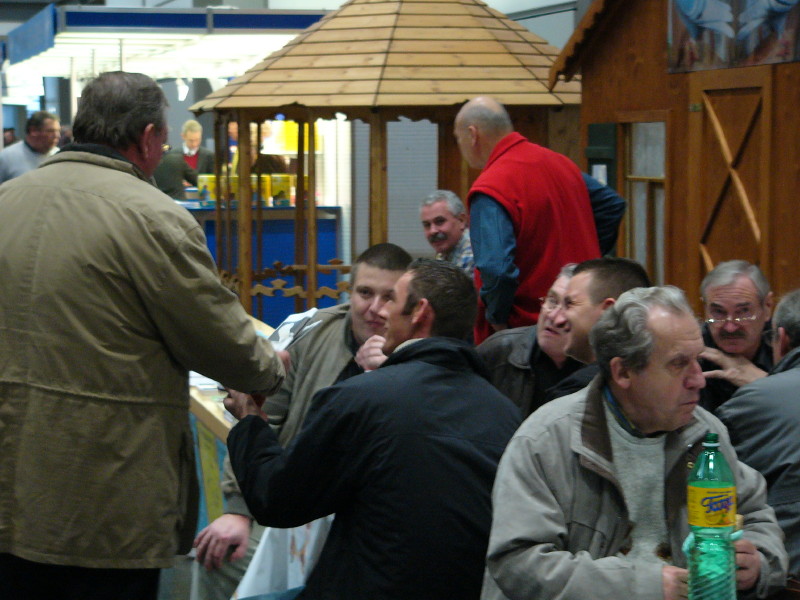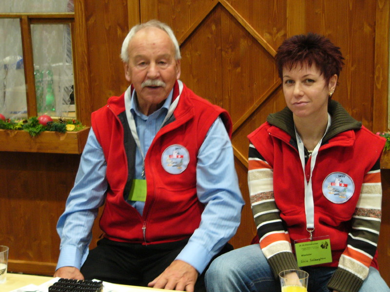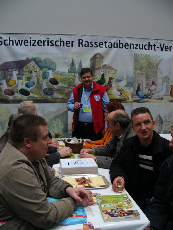 Ernst Walser Präsident des Schweizer Tauberzüchterclubs und Wolfgand Pfeiffer Vorsitzender des SV Schweizer Taubenrassen in Deutschland im Gespräch. Fritz Eggimann und Sylvia Freiburghaus an Stand des Schweizer Tauberzüchterclubs. Am Stand des Schweizer Tauberzüchterclubs war immer was los und die Brotzeit und der Wein waren auch lecker.